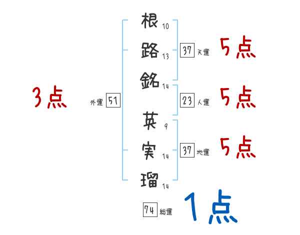 総運![]() | 根路銘英実瑠さんの総運は74画の1つ星!無気力で怠惰な生活送りがち。規則正しい生活を送るよう気をつけましょう。 あなたの人生を表す1番重要な運勢です。生涯を通じて影響する総合運となり、主に50歳以降の晩年期に影響を及ぼします。 |