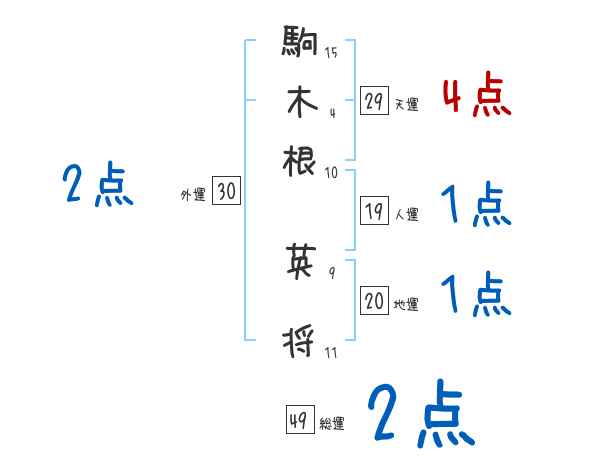 天運![]() | 駒木根英将さんの天運は29画の4つ星!完全主義で才能がある。厳格な心の持ち主。 家系が持つ宿命的な運勢を表します。祖先から受け継いだ苗字ですので自分の力が及びません。家柄を象徴します。 |