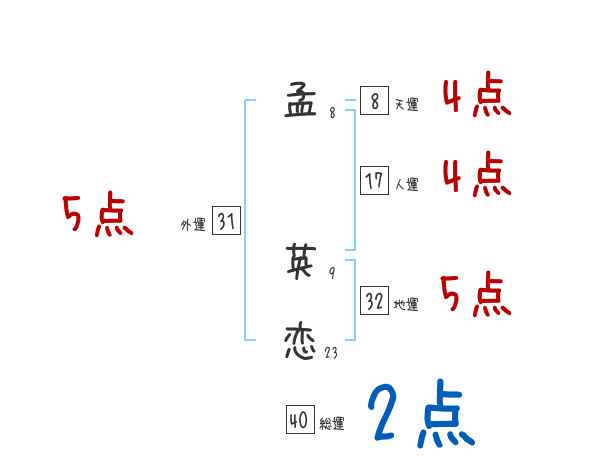 天運![]() | 孟英恋さんの天運は8画の4つ星!勤勉家。根気強く努力し成功する。忍耐力がある。 家系が持つ宿命的な運勢を表します。祖先から受け継いだ苗字ですので自分の力が及びません。家柄を象徴します。 |
