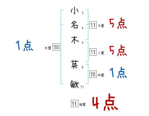 人運![]() | 小名木英敏さんの人運は13画の5つ星!才能に恵まれ人気がある。名声を手に入れる。円満な人生。 性格や才能などを表す2番目に重要な運勢です。人間関係や協調性、社会的な成功に影響します。主に20歳から50歳ぐらいまでの中年期の運勢を表します。 |