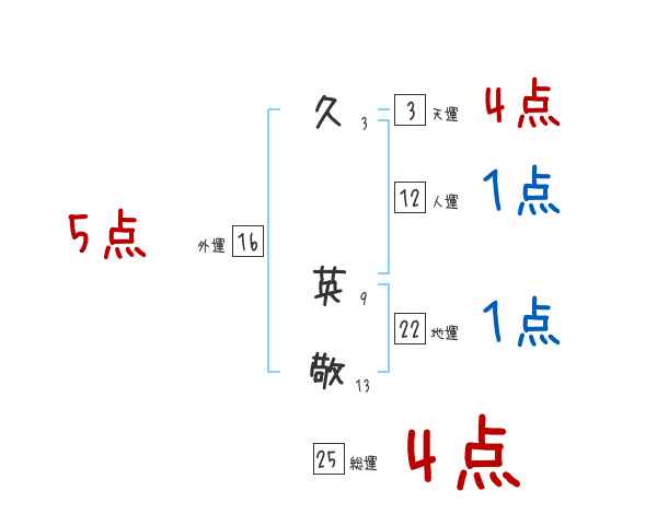 天運![]() | 久英敬さんの天運は3画の4つ星!活動的で才能に恵まれ、多くの信頼を得る。希望に満ち成長する。 家系が持つ宿命的な運勢を表します。祖先から受け継いだ苗字ですので自分の力が及びません。家柄を象徴します。 |