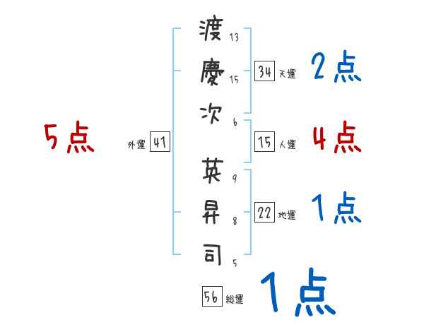 総運![]() | 渡慶次英昇司さんの総運は56画の1つ星!消極的で無気力になりがち。誠実な気持ちが必要でしょう。 あなたの人生を表す1番重要な運勢です。生涯を通じて影響する総合運となり、主に50歳以降の晩年期に影響を及ぼします。 |
