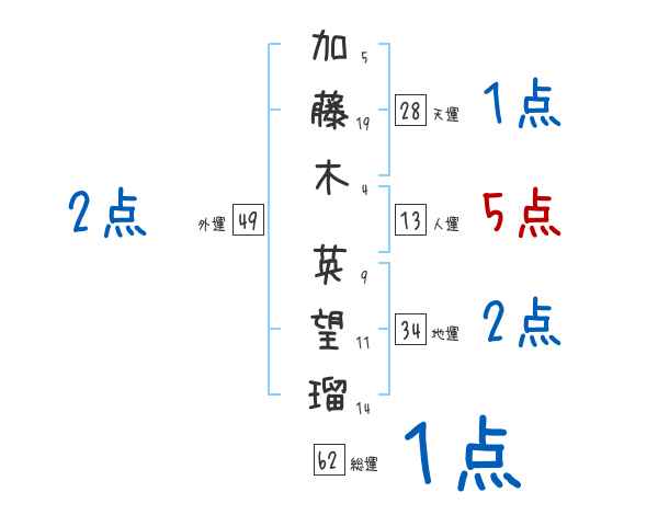天運![]() | 加藤木英望瑠さんの天運は28画の1つ星!家庭環境に注意。スポーツで活躍できる能力があるかも。 家系が持つ宿命的な運勢を表します。祖先から受け継いだ苗字ですので自分の力が及びません。家柄を象徴します。 |