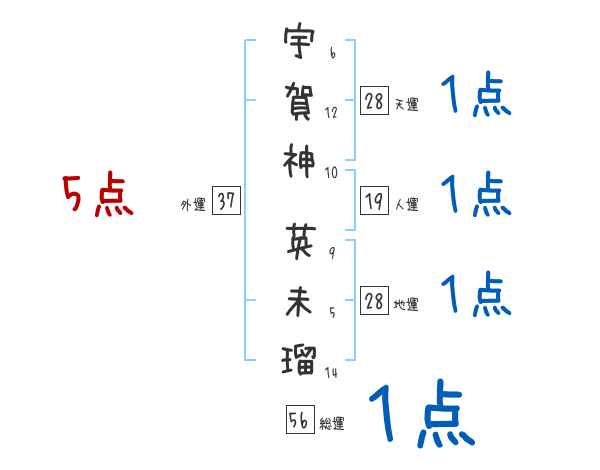 天運![]() | 宇賀神英未瑠さんの天運は28画の1つ星!家庭環境に注意。スポーツで活躍できる能力があるかも。 家系が持つ宿命的な運勢を表します。祖先から受け継いだ苗字ですので自分の力が及びません。家柄を象徴します。 |
