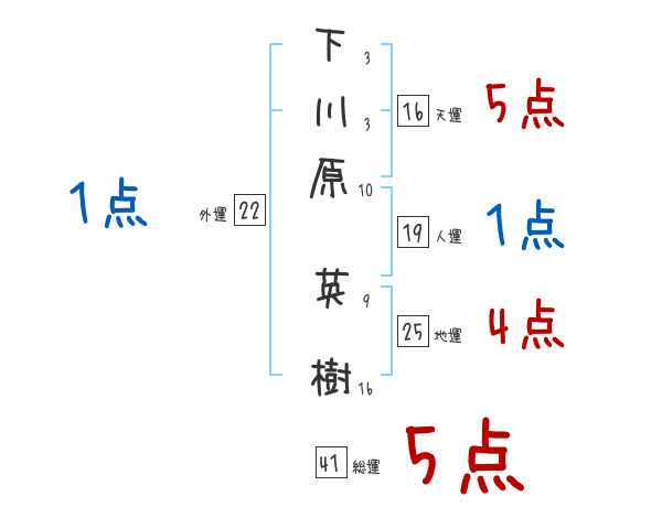 天運![]() | 下川原英樹さんの天運は16画の5つ星!人望が厚く大きく発展する。逆転成功が見える。 家系が持つ宿命的な運勢を表します。祖先から受け継いだ苗字ですので自分の力が及びません。家柄を象徴します。 |