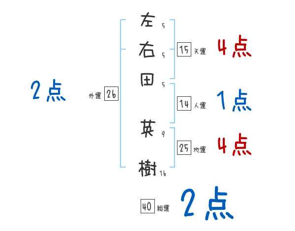 外運![]() | 左右田英樹さんの外運は26画の2つ星!波瀾万丈かも。信頼できる人を大事にしましょう。 生活面を象徴する運勢です。外部から受ける影響力を表し、結婚運、家庭運や職場、環境への順応性を表します。 |