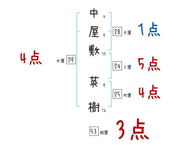 総運![]() | 中屋敷英樹さんの総運は53画の3つ星!やや見栄っ張りで虚栄心がある。散財に注意。 あなたの人生を表す1番重要な運勢です。生涯を通じて影響する総合運となり、主に50歳以降の晩年期に影響を及ぼします。 |