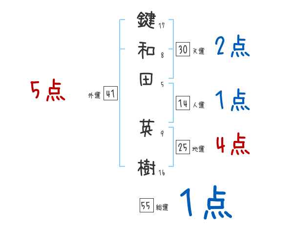 天運![]() | 鍵和田英樹さんの天運は30画の2つ星!浮き沈みの激しさに注意しましょう。 家系が持つ宿命的な運勢を表します。祖先から受け継いだ苗字ですので自分の力が及びません。家柄を象徴します。 |