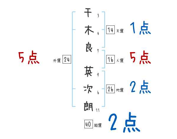 人運![]() | 千木良英次朗さんの人運は16画の5つ星!人望が厚く大きく発展する。逆転成功が見える。 性格や才能などを表す2番目に重要な運勢です。人間関係や協調性、社会的な成功に影響します。主に20歳から50歳ぐらいまでの中年期の運勢を表します。 |