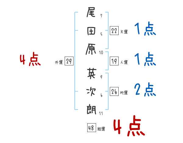 外運![]() | 尾田原英次朗さんの外運は29画の4つ星!完全主義で才能がある。厳格な心の持ち主。 生活面を象徴する運勢です。外部から受ける影響力を表し、結婚運、家庭運や職場、環境への順応性を表します。 |