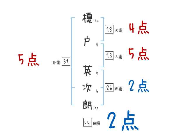 総運![]() | 榎戸英次朗さんの総運は44画の2つ星!誠実で慎重な性格。物事を考えすぎないように注意しましょう。 あなたの人生を表す1番重要な運勢です。生涯を通じて影響する総合運となり、主に50歳以降の晩年期に影響を及ぼします。 |
