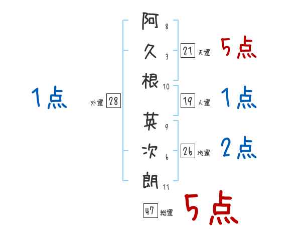 総運![]() | 阿久根英次朗さんの総運は47画の5つ星!実力が開花し発展する円満な人生。財に恵まれる。 あなたの人生を表す1番重要な運勢です。生涯を通じて影響する総合運となり、主に50歳以降の晩年期に影響を及ぼします。 |