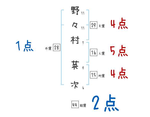 人運![]() | 野々村英次さんの人運は16画の5つ星!人望が厚く大きく発展する。逆転成功が見える。 性格や才能などを表す2番目に重要な運勢です。人間関係や協調性、社会的な成功に影響します。主に20歳から50歳ぐらいまでの中年期の運勢を表します。 |