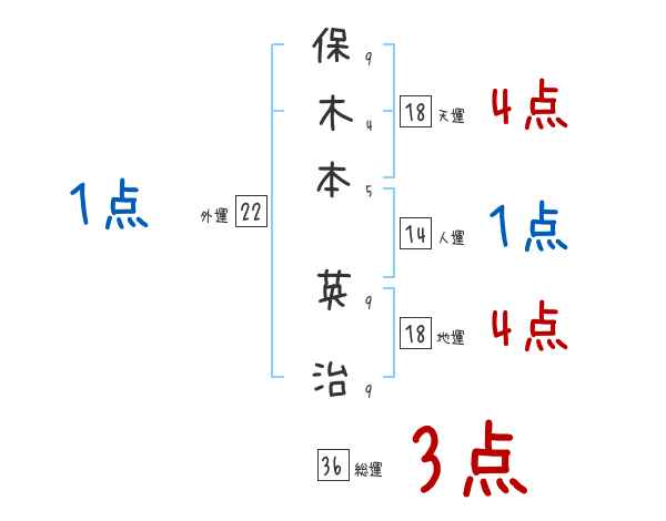 天運![]() | 保木本英治さんの天運は18画の4つ星!情熱的で剛気。忍耐力があり信頼される。 家系が持つ宿命的な運勢を表します。祖先から受け継いだ苗字ですので自分の力が及びません。家柄を象徴します。 |