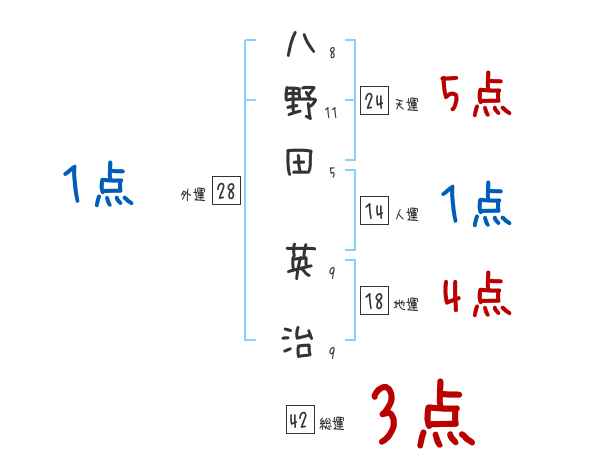 外運![]() | 八野田英治さんの外運は28画の1つ星!家庭環境に注意。スポーツで活躍できる能力があるかも。 生活面を象徴する運勢です。外部から受ける影響力を表し、結婚運、家庭運や職場、環境への順応性を表します。 |