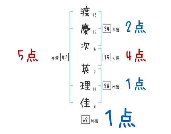 外運![]() | 渡慶次英理佳さんの外運は47画の5つ星!実力が開花し発展する円満な人生。財に恵まれる。 生活面を象徴する運勢です。外部から受ける影響力を表し、結婚運、家庭運や職場、環境への順応性を表します。 |