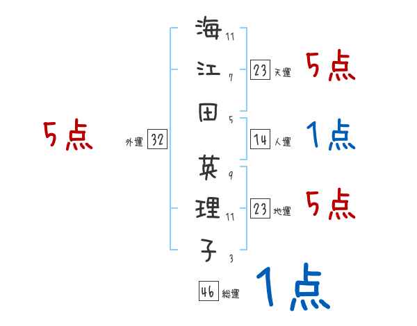外運![]() | 海江田英理子さんの外運は32画の5つ星!柔軟性があり成功する。チャンスが多く金運が良い。 生活面を象徴する運勢です。外部から受ける影響力を表し、結婚運、家庭運や職場、環境への順応性を表します。 |