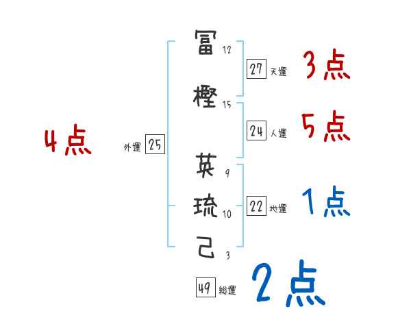 外運![]() | 冨樫英琉己さんの外運は25画の4つ星!個性があり才能があふれる。強運の持ち主で発展する。 生活面を象徴する運勢です。外部から受ける影響力を表し、結婚運、家庭運や職場、環境への順応性を表します。 |