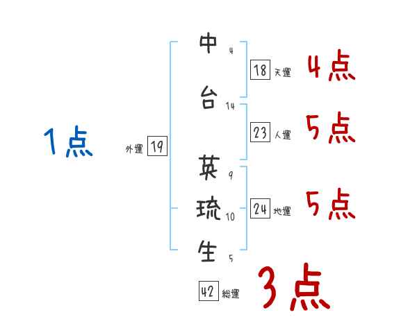 外運![]() | 中台英琉生さんの外運は19画の1つ星!優れた才能を持ちますが、協調性が足りないことも。周りの人と協力する事を意識しましょう。 生活面を象徴する運勢です。外部から受ける影響力を表し、結婚運、家庭運や職場、環境への順応性を表します。 |