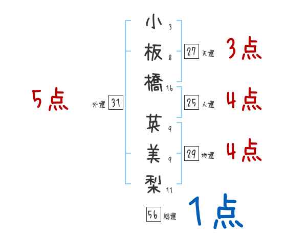 総運![]() | 小板橋英美梨さんの総運は56画の1つ星!消極的で無気力になりがち。誠実な気持ちが必要でしょう。 あなたの人生を表す1番重要な運勢です。生涯を通じて影響する総合運となり、主に50歳以降の晩年期に影響を及ぼします。 |