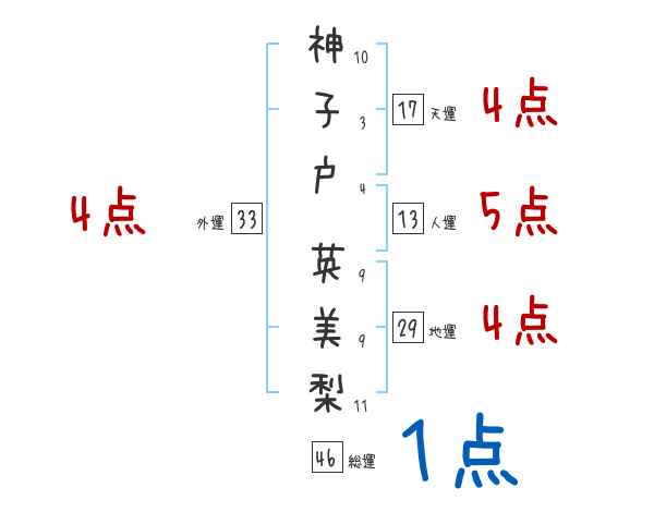 外運![]() | 神子戸英美梨さんの外運は33画の4つ星!権力志向でプライドが高い。勇気があり運を切り開き成功する。 生活面を象徴する運勢です。外部から受ける影響力を表し、結婚運、家庭運や職場、環境への順応性を表します。 |
