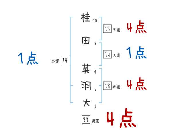 総運![]() | 桂田英羽大さんの総運は33画の4つ星!権力志向でプライドが高い。勇気があり運を切り開き成功する。 あなたの人生を表す1番重要な運勢です。生涯を通じて影響する総合運となり、主に50歳以降の晩年期に影響を及ぼします。 |