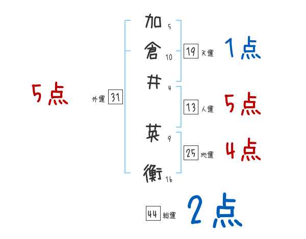 総運![]() | 加倉井英衡さんの総運は44画の2つ星!誠実で慎重な性格。物事を考えすぎないように注意しましょう。 あなたの人生を表す1番重要な運勢です。生涯を通じて影響する総合運となり、主に50歳以降の晩年期に影響を及ぼします。 |