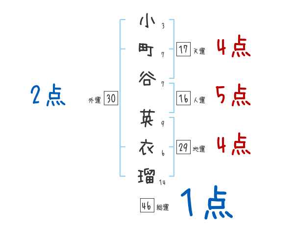 人運![]() | 小町谷英衣瑠さんの人運は16画の5つ星!人望が厚く大きく発展する。逆転成功が見える。 性格や才能などを表す2番目に重要な運勢です。人間関係や協調性、社会的な成功に影響します。主に20歳から50歳ぐらいまでの中年期の運勢を表します。 |