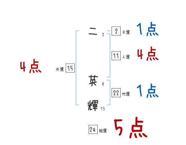 地運![]() | 二英輝さんの地運は22画の1つ星!努力することが苦手ないっぽう手先が器用。芸術性にも優れる。 個性を表す基礎的な運勢です。性格形成や対人関係、行動力など家庭環境に影響されます。主に誕生してから20歳くらいまでの若年期の運勢を表します。 |