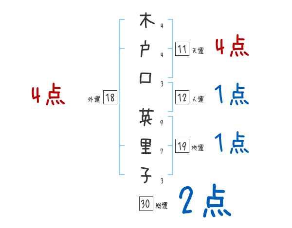 外運![]() | 木戸口英里子さんの外運は18画の4つ星!情熱的で剛気。忍耐力があり信頼される。 生活面を象徴する運勢です。外部から受ける影響力を表し、結婚運、家庭運や職場、環境への順応性を表します。 |