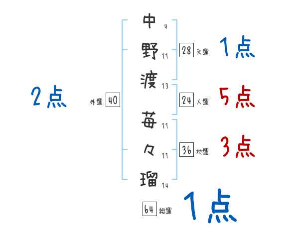 人運![]() | 中野渡苺々瑠さんの人運は24画の5つ星!家庭運が良く順調な人生。金運にも恵まれる。 性格や才能などを表す2番目に重要な運勢です。人間関係や協調性、社会的な成功に影響します。主に20歳から50歳ぐらいまでの中年期の運勢を表します。 |