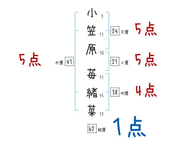 人運![]() | 小笠原苺緒菜さんの人運は21画の5つ星!統率力がある。独立し成功する。名誉を手に入れる。 性格や才能などを表す2番目に重要な運勢です。人間関係や協調性、社会的な成功に影響します。主に20歳から50歳ぐらいまでの中年期の運勢を表します。 |