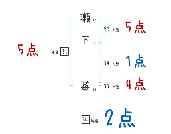総運![]() | 瀬下苺さんの総運は34画の2つ星!独創性に優れるが、自尊心が強く災難に注意しましょう。 あなたの人生を表す1番重要な運勢です。生涯を通じて影響する総合運となり、主に50歳以降の晩年期に影響を及ぼします。 |