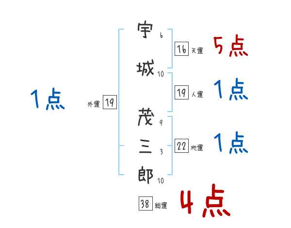 外運![]() | 宇城茂三郎さんの外運は19画の1つ星!優れた才能を持ちますが、協調性が足りないことも。周りの人と協力する事を意識しましょう。 生活面を象徴する運勢です。外部から受ける影響力を表し、結婚運、家庭運や職場、環境への順応性を表します。 |