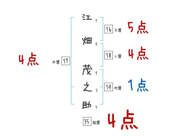 外運![]() | 江畑茂之助さんの外運は17画の4つ星!積極的な行動力。地位を気づき財産を手に入れる。純粋な心と直感力。 生活面を象徴する運勢です。外部から受ける影響力を表し、結婚運、家庭運や職場、環境への順応性を表します。 |
