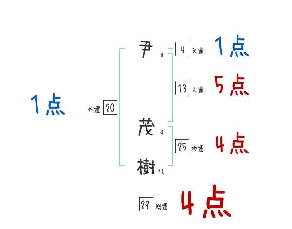 天運![]() | 尹茂樹さんの天運は4画の1つ星!感情が不安定で苦労するかも。周囲との協調を心掛けましょう。 家系が持つ宿命的な運勢を表します。祖先から受け継いだ苗字ですので自分の力が及びません。家柄を象徴します。 |