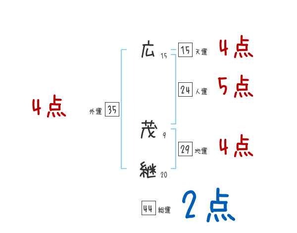 総運![]() | 広茂継さんの総運は44画の2つ星!誠実で慎重な性格。物事を考えすぎないように注意しましょう。 あなたの人生を表す1番重要な運勢です。生涯を通じて影響する総合運となり、主に50歳以降の晩年期に影響を及ぼします。 |