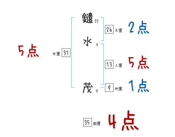 天運![]() | 鑓水茂さんの天運は26画の2つ星!波瀾万丈かも。信頼できる人を大事にしましょう。 家系が持つ宿命的な運勢を表します。祖先から受け継いだ苗字ですので自分の力が及びません。家柄を象徴します。 |