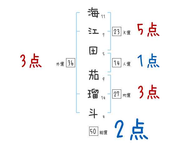 外運![]() | 海江田茄瑠斗さんの外運は36画の3つ星!先見性が豊かです。多少神経質で苦労することも。 生活面を象徴する運勢です。外部から受ける影響力を表し、結婚運、家庭運や職場、環境への順応性を表します。 |