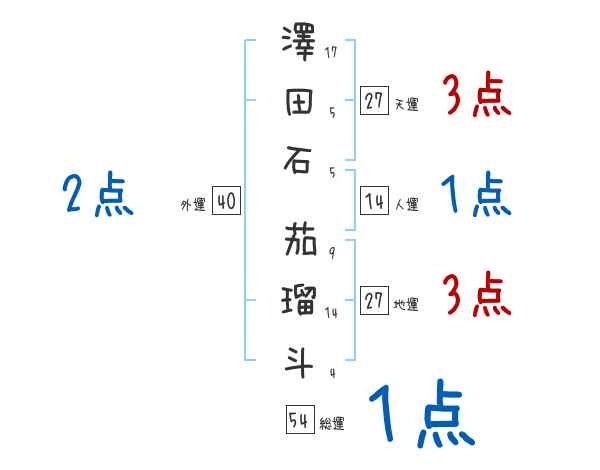 地運![]() | 澤田石茄瑠斗さんの地運は27画の3つ星!頭脳明晰だが強情で摩擦が多い傾向。孤立に注意。 個性を表す基礎的な運勢です。性格形成や対人関係、行動力など家庭環境に影響されます。主に誕生してから20歳くらいまでの若年期の運勢を表します。 |
