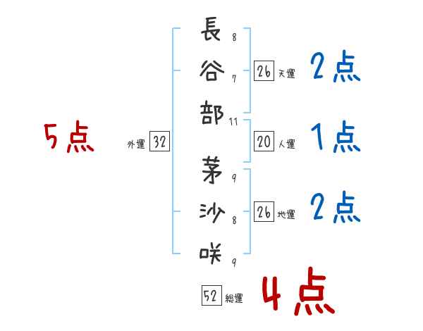 外運![]() | 長谷部茅沙咲さんの外運は32画の5つ星!柔軟性があり成功する。チャンスが多く金運が良い。 生活面を象徴する運勢です。外部から受ける影響力を表し、結婚運、家庭運や職場、環境への順応性を表します。 |
