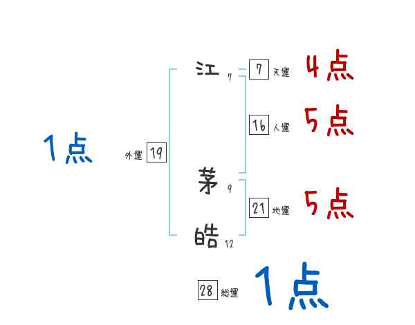人運![]() | 江茅皓さんの人運は16画の5つ星!人望が厚く大きく発展する。逆転成功が見える。 性格や才能などを表す2番目に重要な運勢です。人間関係や協調性、社会的な成功に影響します。主に20歳から50歳ぐらいまでの中年期の運勢を表します。 |