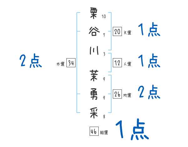 総運![]() | 栗谷川茉勇采さんの総運は46画の1つ星!迷走することが多く苦労するかも。目先のことにとらわれないように。 あなたの人生を表す1番重要な運勢です。生涯を通じて影響する総合運となり、主に50歳以降の晩年期に影響を及ぼします。 |