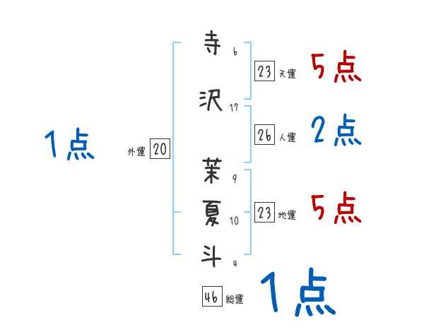 天運![]() | 寺沢茉夏斗さんの天運は23画の5つ星!想像力に優れ活力がある。一代で成功し名誉を手に入れる。 家系が持つ宿命的な運勢を表します。祖先から受け継いだ苗字ですので自分の力が及びません。家柄を象徴します。 |