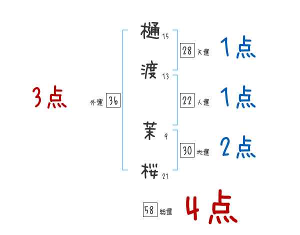 外運![]() | 樋渡茉桜さんの外運は36画の3つ星!先見性が豊かです。多少神経質で苦労することも。 生活面を象徴する運勢です。外部から受ける影響力を表し、結婚運、家庭運や職場、環境への順応性を表します。 |