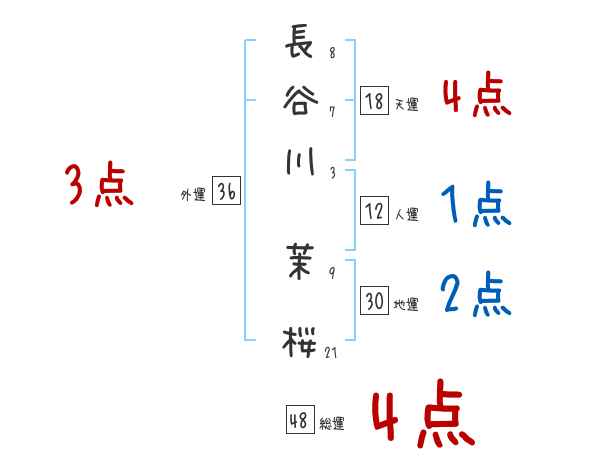 外運![]() | 長谷川茉桜さんの外運は36画の3つ星!先見性が豊かです。多少神経質で苦労することも。 生活面を象徴する運勢です。外部から受ける影響力を表し、結婚運、家庭運や職場、環境への順応性を表します。 |