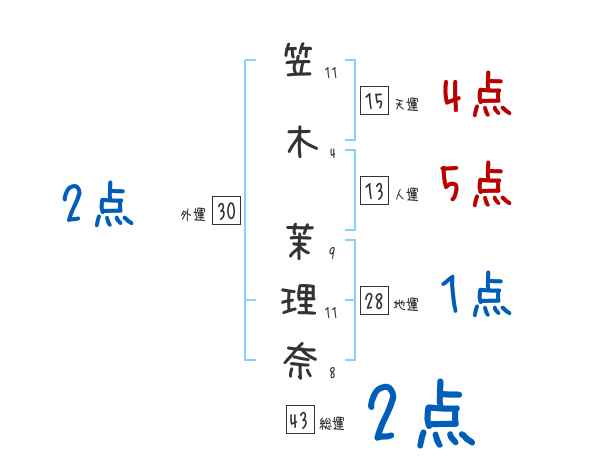 外運![]() | 笠木茉理奈さんの外運は30画の2つ星!浮き沈みの激しさに注意しましょう。 生活面を象徴する運勢です。外部から受ける影響力を表し、結婚運、家庭運や職場、環境への順応性を表します。 |