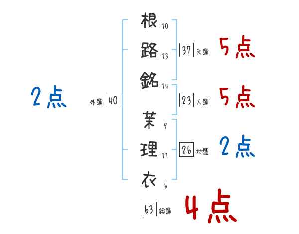 総運![]() | 根路銘茉理衣さんの総運は63画の4つ星!家庭運がよく順調な生活。温和な性格。 あなたの人生を表す1番重要な運勢です。生涯を通じて影響する総合運となり、主に50歳以降の晩年期に影響を及ぼします。 |