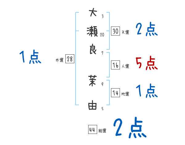 天運![]() | 大瀬良茉由さんの天運は30画の2つ星!浮き沈みの激しさに注意しましょう。 家系が持つ宿命的な運勢を表します。祖先から受け継いだ苗字ですので自分の力が及びません。家柄を象徴します。 |