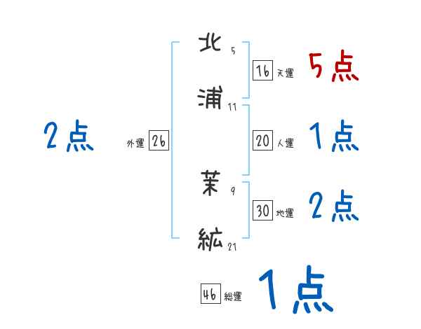 天運![]() | 北浦茉絋さんの天運は16画の5つ星!人望が厚く大きく発展する。逆転成功が見える。 家系が持つ宿命的な運勢を表します。祖先から受け継いだ苗字ですので自分の力が及びません。家柄を象徴します。 |
